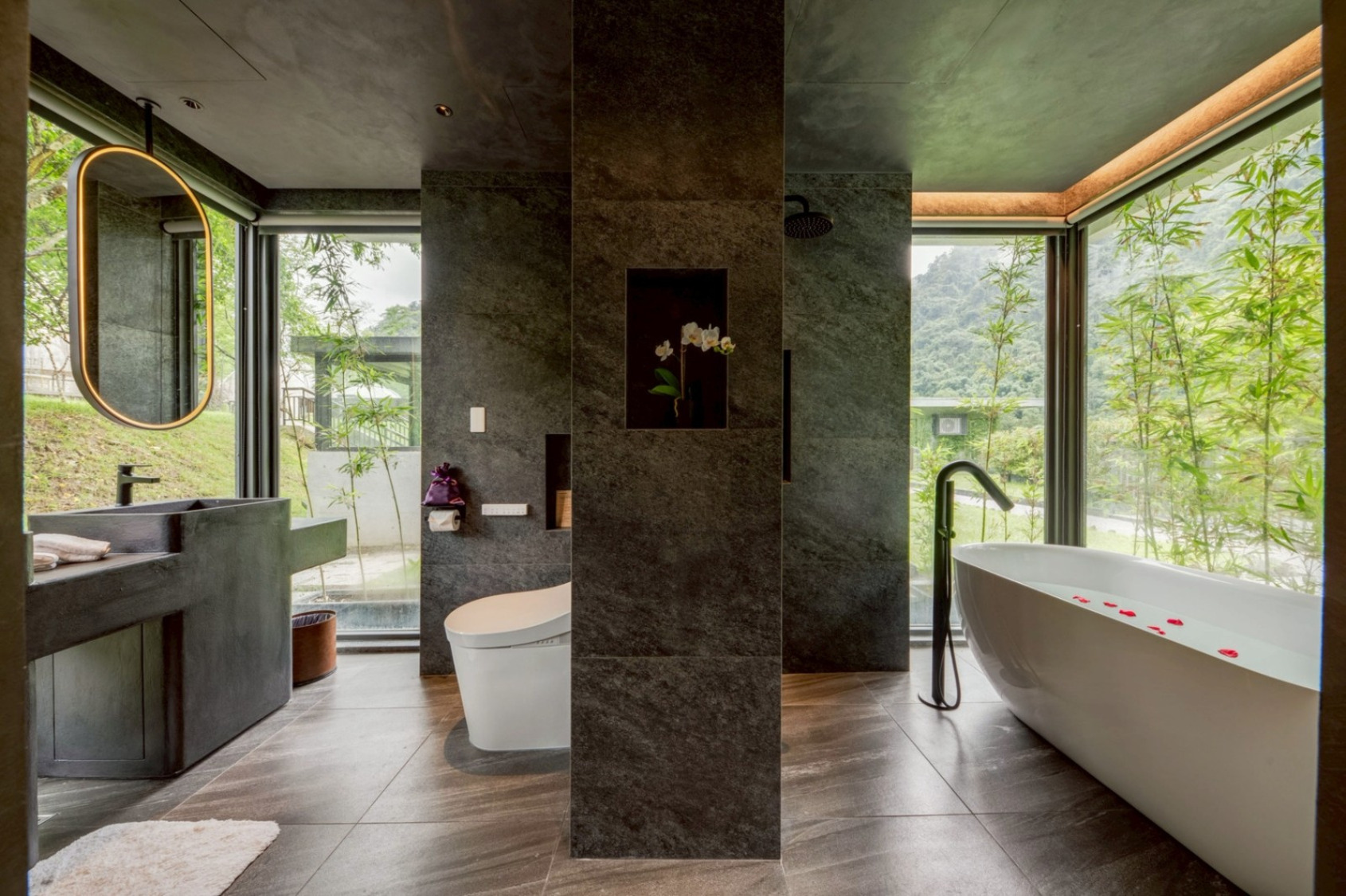 • 岩|深色石材與雙溫泉浴池,將溪谷與岩壁之力帶入居所。