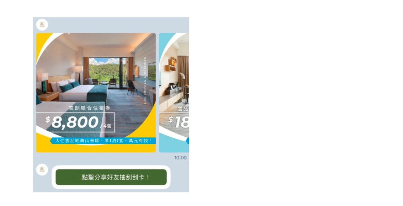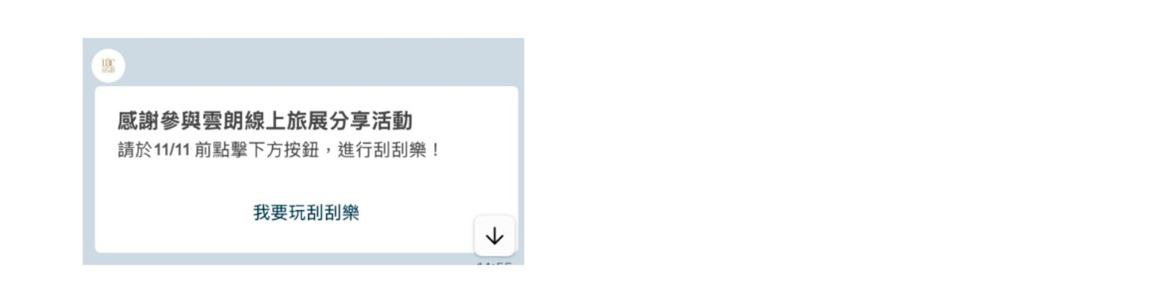 點此前往雲朗小管家>(二)10/28前加入「雲品小管家」LINE官方帳號,並於10/29-11/5期間點擊線上旅展訊息下方「立即分享好友」按鈕並成功分享者,將可獲得刮刮卡一張(刮刮卡11/7統一發送,每個LINE帳號限玩一次)。