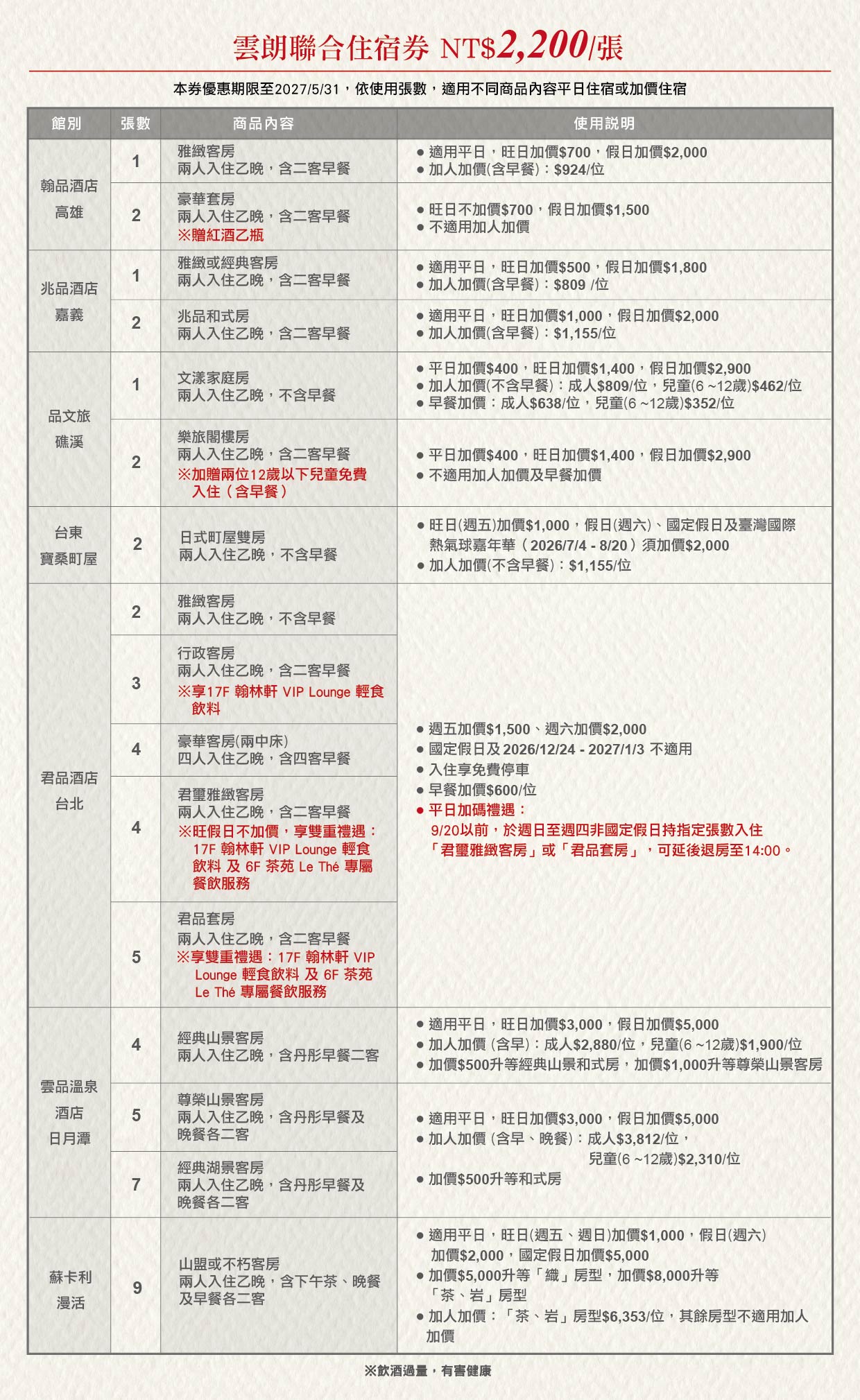 6.本券於雲品使用僅適用於散客訂房,8間以上團體不適用,並請事先訂房。